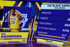 转播方晒数据:湖人系列赛3-0火箭,八村塁场均砍下16.3分3.7篮板,命中率56%,三分53%。