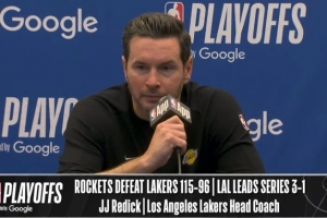 体育资讯4月27日讯 NBA季后赛首轮G4,湖人96-115不敌火箭,系列赛大比分来到3-1。赛后JJ·雷迪克接受了媒体采访,以下为采访全文。