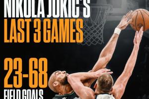 最近3场比赛,约基奇命中率低迷,合计投篮68投23中,命中率只有33.8%;合计三分20投3中,命中率只有15%。
