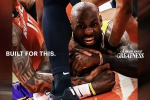 体育资讯4月26日讯 今日,湖人官推晒出一张昨日在湖人击败火箭的季后赛首轮G3加时赛中,詹姆斯倒地奋力拼抢球权的海报。