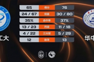 第四节,杨淇淞三分再中,华中科大持续发力不断扩大优势,张海豪补篮得手将分差拉开到20分,此后华中科大突然哑火,湖北工大完成13-0的攻击波缩小分差,无奈时间所剩无几。最终,华中科大76-65力克湖北工大。