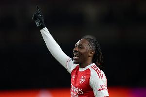 体育资讯4月26日讯 英超第34轮,阿森纳主场对阵纽卡。比赛第9分钟,埃泽通过角球远射破门。