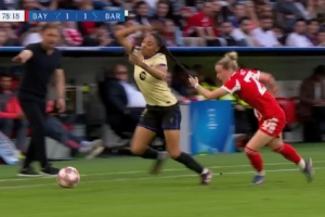 体育资讯4月26日讯 女足欧冠半决赛首回合,拜仁女足主场1-1战平巴萨女足。本场比赛,拜仁后卫弗兰齐斯卡·凯特因拉扯巴萨前锋萨尔玛的头发被直红罚下,这一判罚引发拜仁方面抗议。